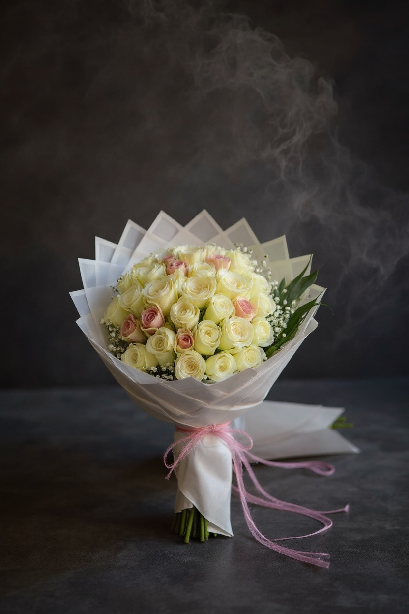 Her biri taze seçilmiş güller, zarif beyaz ambalajla sarılarak sade ama etkileyici bir görünüm kazanır.