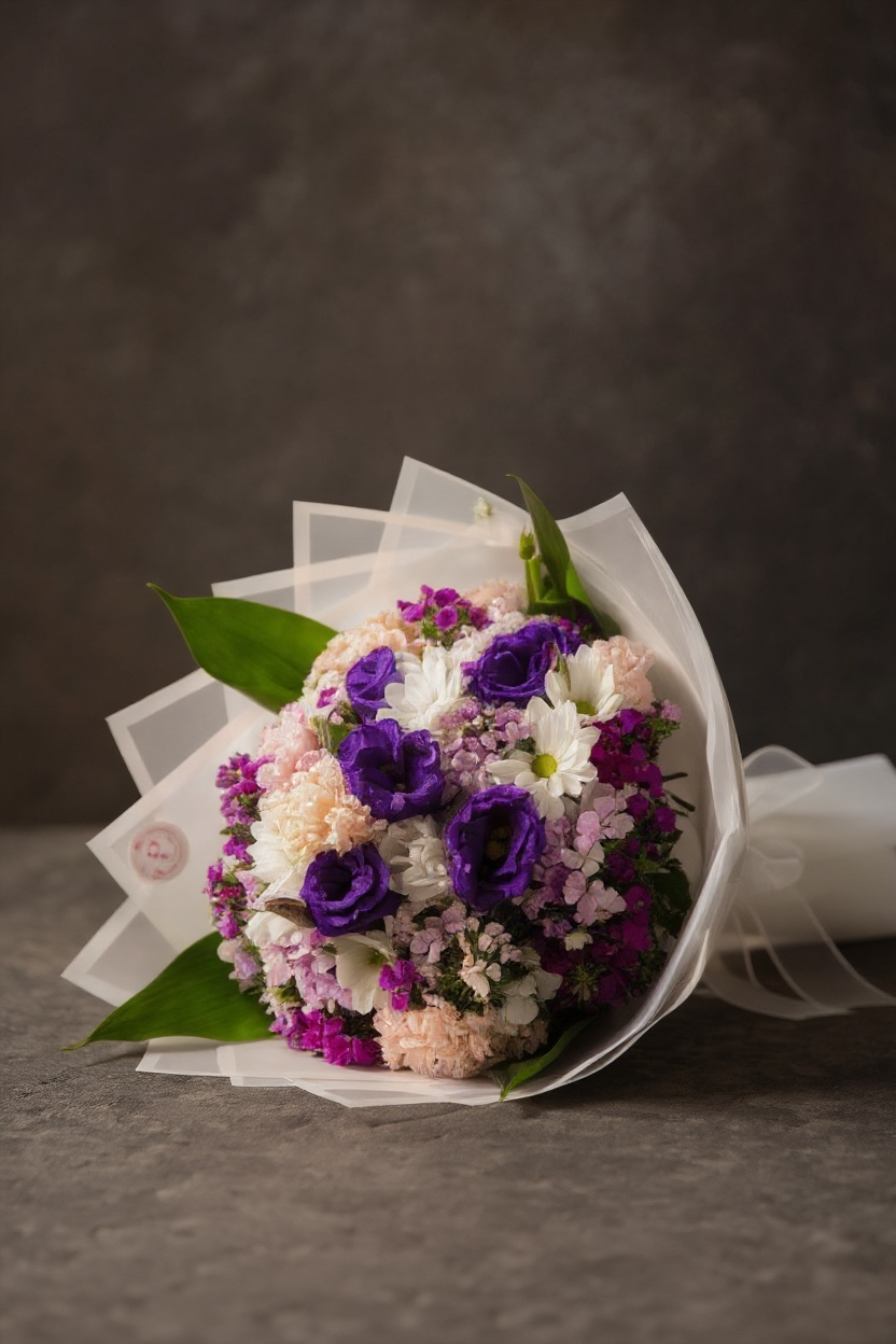 Lavender Mist, mor ve beyaz tonların romantik uyumunu taşıyan özel bir bukettir.