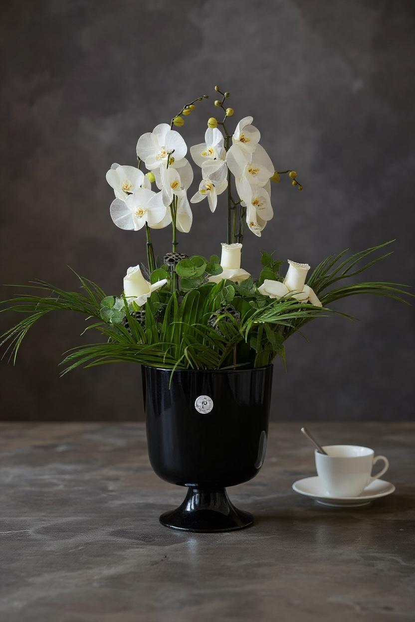 Şık siyah saksı içerisinde yer alan zarif beyaz orkideler, yeşil bitkiler ve okaliptus yapraklarıyla birleşerek modern ve asil bir görünüm oluşturur.