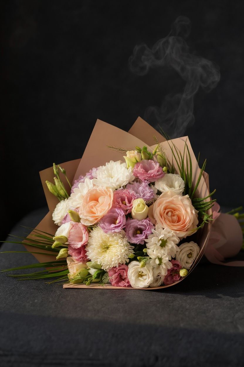 🌸 Çiçek Türleri: Somon Gül, Lila Lisianthus, Beyaz Kasımpatı & Ranunculus