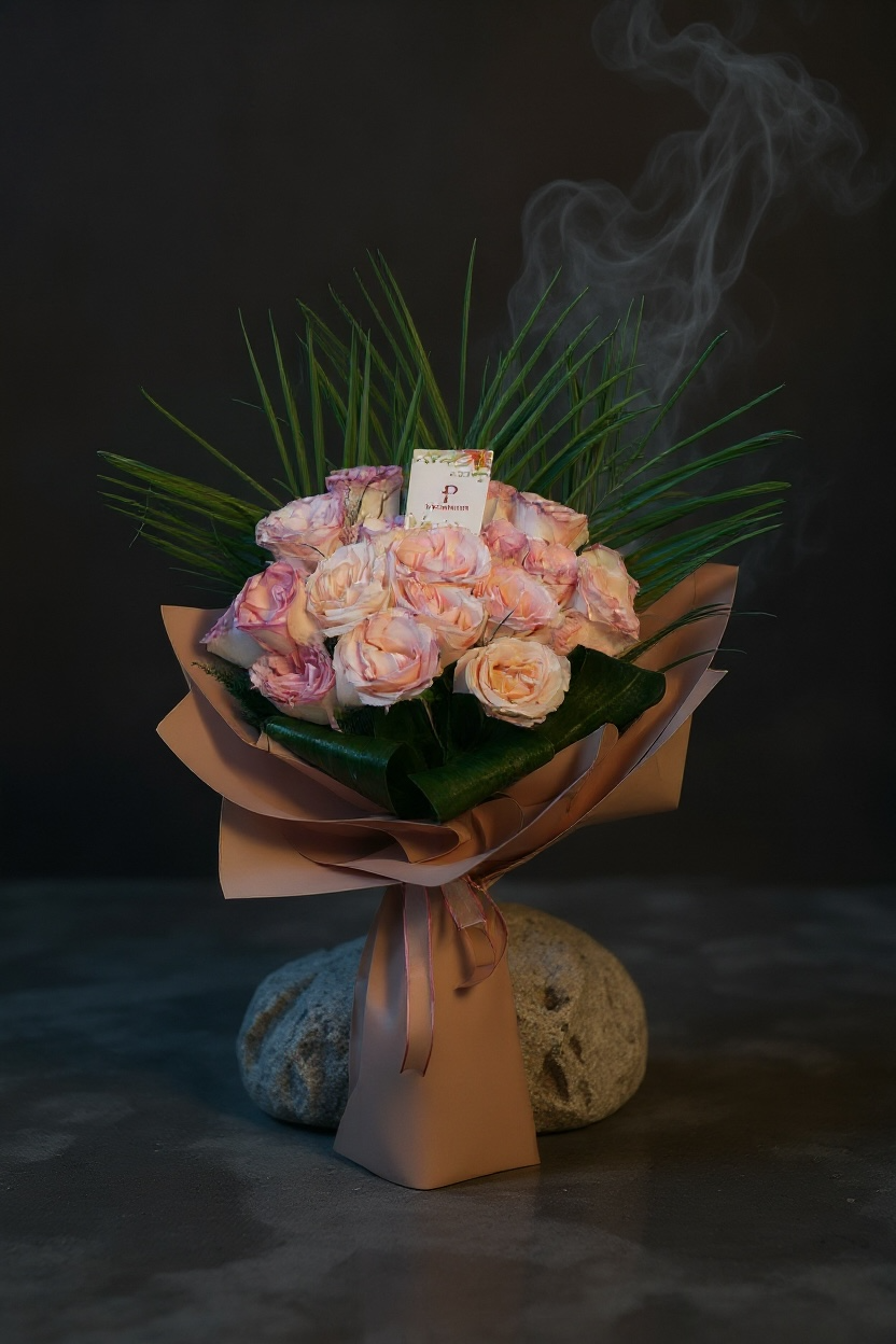 Her biri özenle seçilmiş somon ve açık pembe güller, yeşil yaprak detayları ve zarif ambalajıyla birleşerek sofistike bir görünüm oluşturur.
