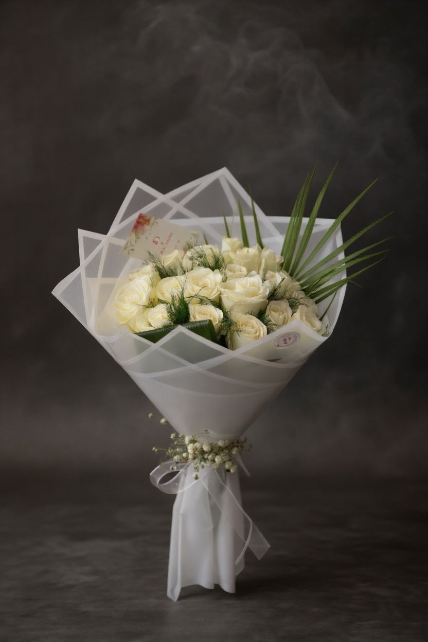 Snowy Elegance, beyaz güllerin masumiyetini ve asaleti modern bir sunumla bir araya getiren özel bir tasarımdır.